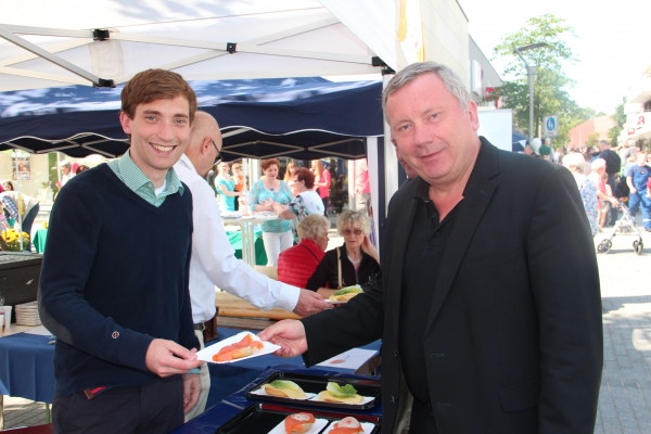 Der CDU-Stand präsentierte sich nicht nur mit Lachs- und Käsebrötchen, sonders hatte auch den CDU-Bundestagsabgeordneten Norbert Brackmann, der auch haushaltspolitischer Sprecher seiner Partei ist und Lukas Kilian, Kreistagsabgeordneter und Vorsitzender des Verkehrsausschusses zu Gast. Sie gaben gerne Auskünfte über die aktuellen Themen des Bundes- und Kreistages. So war es auch kein Wunder, dass Brackmann sehr häufig auf die Griechenlandkrise angesprochen wurde, die sich gerade nach dem Abbruch der Verhandlungen der EU-Kommission, der EZB, des IWF und der zahlenden EU-Länder zuspitzte. Er machte deutlich, dass egal wie die Verhandlungen der EU-Finanzminister, der Regierungschefs und schließlich des Bundestages ausgehen würden, ob drittes Hilfspaket oder Rettungsfonds, alles Geld kosten würde, auf das die geldgebenden Länder und Institutionen lange Zeit oder vielleicht für immer verzichten müssten. ,,Andere Länder, wie Irland, Portugal, Zypern oder Spanien haben ihre Krisenschiffe auch aus eigener Kraft wieder flott bekommen", merkte er an. Zum Zeitpunkt des Marktfestes war der Ausgang der folgenden vielen Verhandlungen und Abstimmungen noch völlig offen. ,,Immerhin müssen sieben Länder auch noch ihre Parlamente fragen", so Brackmann.